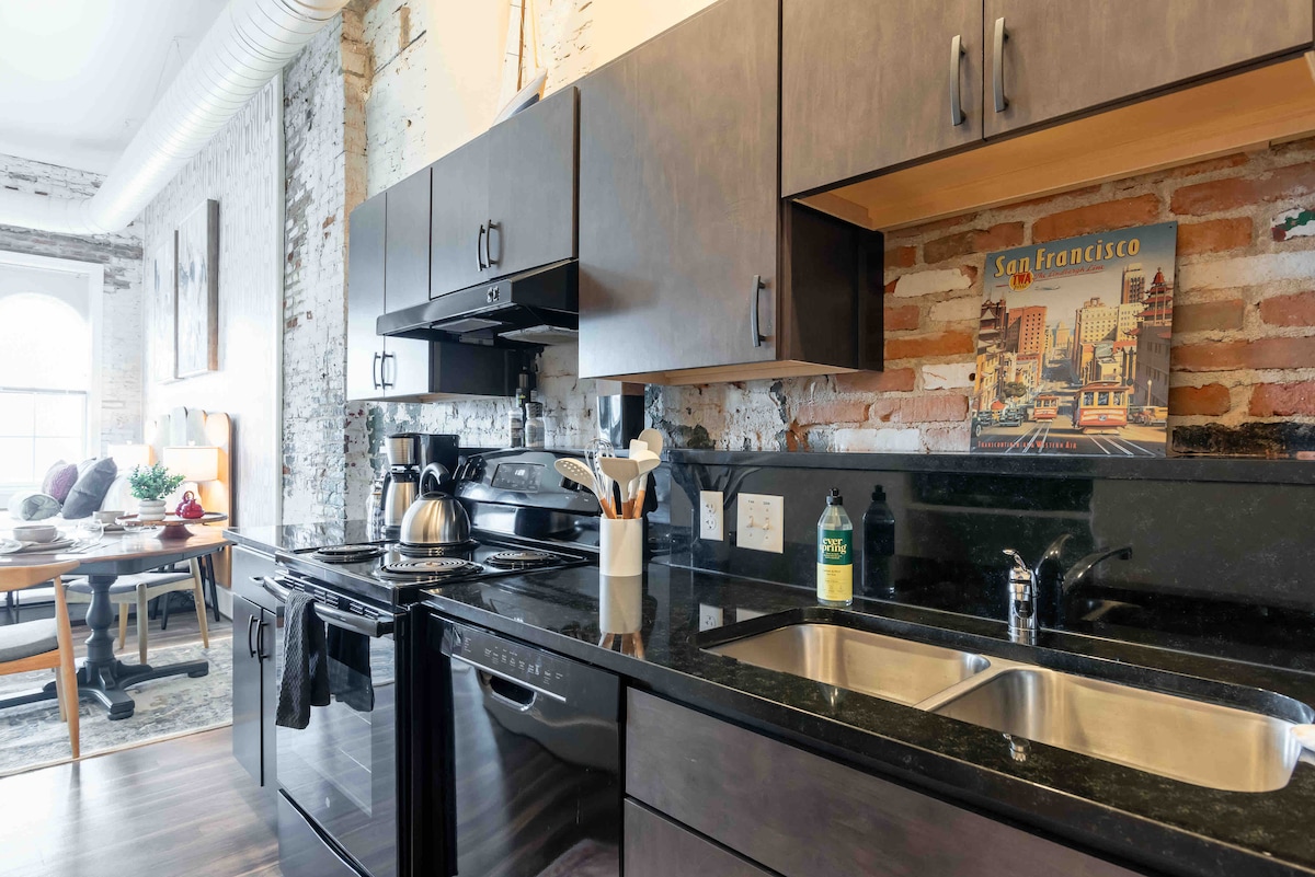 Le ndawo intle nekhanyayo inesilingi yeenyawo eziyi-12 kunye nezitena eziveziweyo kuyo yonke indawo. Yonwabela ikhitshi elimiselwe kakuhle ukuze upheke isidlo esikhawulezayo, okanye uphume ngaphandle komnyango wakho wangaphambili uze wonwabele iivenkile zokutyela zasekuhlaleni! I-Smart TV inevidiyo ephambili yokuzonwabisa kwakho! I-loft inebhedi enkulu enobunewunewu enesofa entle yokuncokola okanye iTV! Yonwabela ukubona iDowntown Depot Town kunye netreyini ngefestile yegumbi lakho lokuhlala!