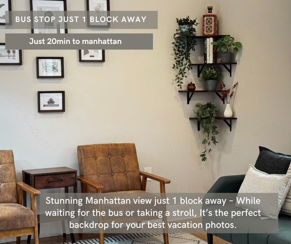 Indawo ekhuselekileyo, yimizuzu eyi-30 kuphela ukuya kwi-Time Square ngebhasi. Phuma kule ndlu uza kuyibona kakuhle indawo ephakamileyo yaseManhattan. Igumbi lokulala labucala kunye negumbi lokuhlambela labucala. Indawo yokupaka ebhatalelwayo eyi- $ 15 ngosuku/imali, kufuneka ibhukishwe kwangaphambili. Le ndlu yasedolophini ineeyunithi ezimbini kumgangatho wesithathu neeyunithi ezimbini kumgangatho wesibini. Uza kunika ezinye iiyunithi umnyango wokungena nezitepsi. Umgangatho wesibini unendawo yokuhlala ebonakalayo, ungabeka iibhegi zakho apho ukuba igumbi alilunganga.