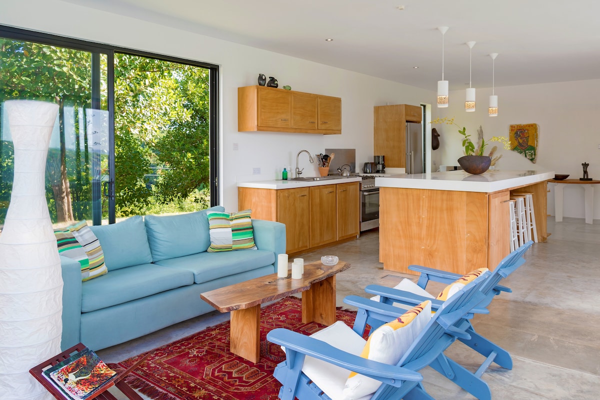 Iholide yethu enomtsalane kwindlu encinci yindawo entle, eneengcongconi kodwa yale mihla phakathi kwemithi yomango kunye nezityalo ezintsha. Isicwangciso esivulekileyo somgangatho siyenza ibe nantoni na encinci ngaphakathi. Indawo yethu yokufihla isiqithi se-spice inento yonke eyenza uzive usekhaya, kuquka ifriji, isitovu, i-microwave, i-tv ethe tyaba, umatshini wokuhlamba nowokomisa impahla ne-wifi. Imibala egqamileyo yeCaribbean kunye nezinto ezitofotofo zekhaya, indlu encinci kaNkosazana Tee yiSpice Island Phatha nje indlela engaqhelekanga:)