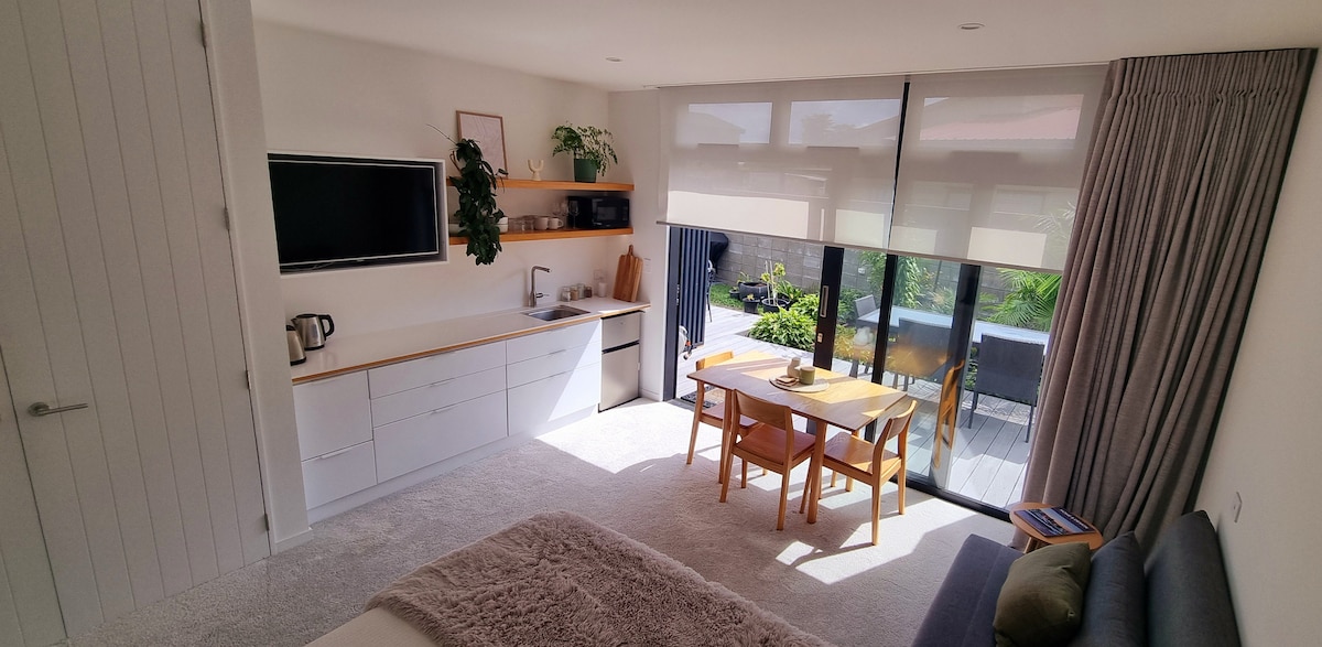 Istudiyo sale mihla esineendawo zaso zokungena zabucala. Imizuzu eyi-5 ukusuka kwiTown Basin; isiseko esifanelekileyo sokubuka iWhangarei. Igumbi lokulala eliphezulu elinebhedi enkulu nelala umntu omnye. Phantsi kwigumbi lokuhlambela elahlukileyo elikufuphi nendawo yokuphumla enobushushu nekhitshi elincinci. Iquka ijagi, i-toaster, ifriji, i-microwave. Ezinye izinto ezibalulekileyo zesidlo sakusasa ezifana nobisi, ukusasazeka, i-muesli, iiti ezahlukeneyo kunye nezibonelelo zekofu njengesiqalo kuphela. I-Freeview TV kunye ne-Netflix. Kwindawo yokupaka imoto enye esesitratweni.