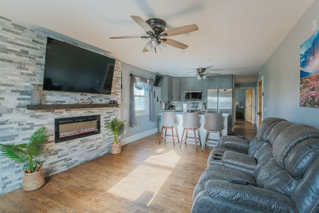 Yonke into oyidingayo ukuze wenze iholide yakho iphumle kwaye ibe lula icingwe kule flethi ihonjiswe kakuhle kuquka i-King Bed entsha, i-Queen sofa pullout bed, i-plush linen, isofa entsha evulekileyo, i-55" Smart TV, i-Roku, i-intanethi eyi-1 Gbps, i-WiFi, i-DVD player kunye neemuvi, ikhitshi elinento yonke, indawo yokutyela ye-4, indawo yokubasa umlilo yeenkuni, kunye neveranda yabucala. Iflethi engatshaywayo. Nceda ufake onke amagama eendwendwe nenkcazelo yenja ukuba ikhona xa kubuzwa okanye kubhukishwa. Azikho iikati okanye ezinye izilwanyana ezamkelweyo.