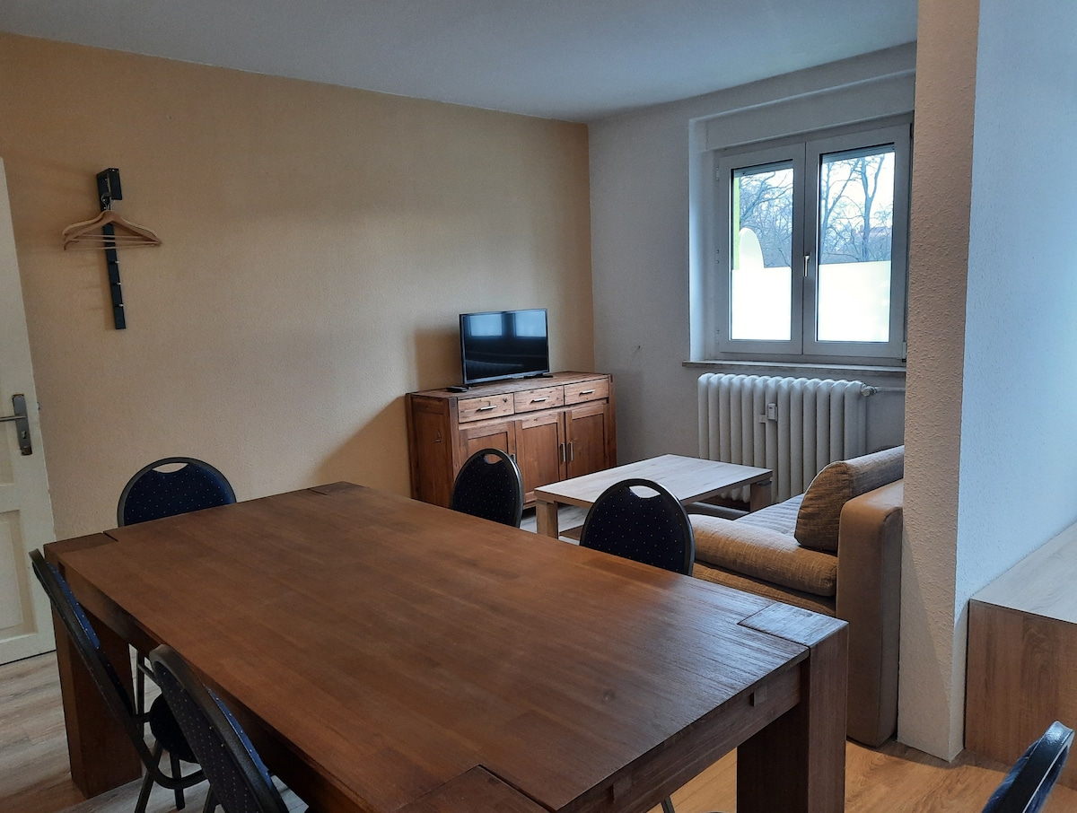 Kwiflethi yethu ekwigumbi elingaphantsi elinefenitshala entle enepaseji, ikhitshi, igumbi lokuhlambela, igumbi lokuhlala negumbi lokulala, uza kuzifumana unobuninzi. Abantu aba-4 bakhawuleza bazive bekhululekile. Iibhedi ezongezelelekileyo zinokwenzeka. Upaka imoto yakho ngqo kwiflethi uze ukwazi ukungena kwihlathi elihle lesixeko ukuze uhambe kakuhle. Wamkelekile ukuba uye kumbindi wesixeko okanye "uthathe imiqulu" emva kokulungiselela kwangaphambili iibhayisekile zethu, kuba oku udinga imizuzu emalunga neyi-15 kuphela. Kodwa ke, azikho iibhayisekile zokhenketho.