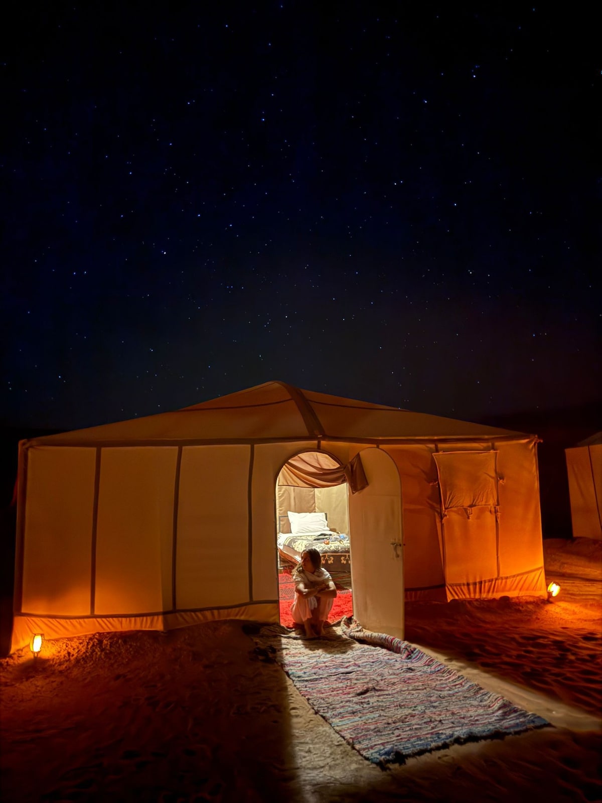 Our Mhamid Desert Camp is set a step away from the famous village of Mhamid, staying in our Camp gives you the opportunity to watch breathtaking sunsets and sunrises, lose yourself in the silence and peacefulness of our charming Berber tents as well as enjoy Berber campfires with traditional music, excellent traditional dinners and breakfasts. You will also have the chance to join one of our desert tours run by our Berber team. PS: if your preferred date are unavailable check our other listing