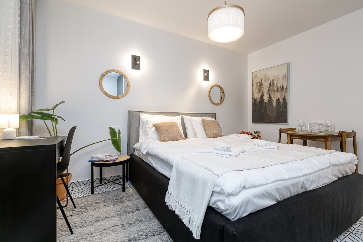 Welcome to our stylish and family-friendly retreat! The first bedroom features a comfortable queen-sized bed, while the second bedroom offers a versatile setup with a sofa bed and a children's bed. Additionally, there's a sofa bed in the living room, providing flexibility for your sleeping arrangements. Also at your disposal - peaceful office space. Book your stay with us and experience the perfect blend of style and comfort. We look forward to hosting your family for a memorable getaway!